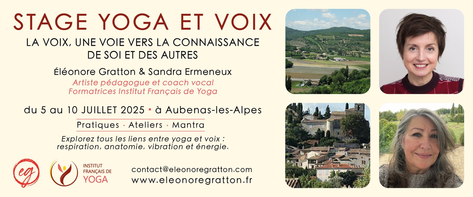 Avec mon amie et collègue Sandra Ermeneux formatrice Institut Français de Yoga, nous proposons un stage cet été où la place sera donné à la maison corps, son habitant au gré d’une fréquence inestimable constitutive de l’être humain: la voix. celle ci résonne, susurre et palpite au gré de nos désirs et besoins. Elle vibre et circule. Plus le corps est libre, plus elle s’exprime avec légèreté et densité. Elle est canal. On explorera toutes ses fondations au sein de la pratique corporelle et révélatrice du yoga. Il reste quelques places info sur mon site ou en message direct.