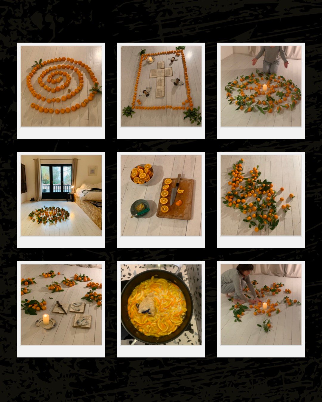 A la Madeleine Arles il y a un oranger amer. A mon arrivée Eugénie et Ludo me disent n’avoir jamais eu le temps d’en tirer le suc, l’envie est là mais leur maison donne déjà bien à faire. Un soir je rentre en amitié avec l’oranger, je cueille environ 80 petites oranges amères et les emporte dans ma chambre. Au sol elles dessinent des formes, associées à mes objets elles deviennent comme des cartes du Tarot de La Madeleine, je lis à travers elles. Nous avons passés deux jours ensemble à se dire la bonne aventure. Nettoyées puis épépinées, découpées avec reconnaissance et enfin cuites, leurs écorces ont une saveur de folie et chantent sous les papilles.